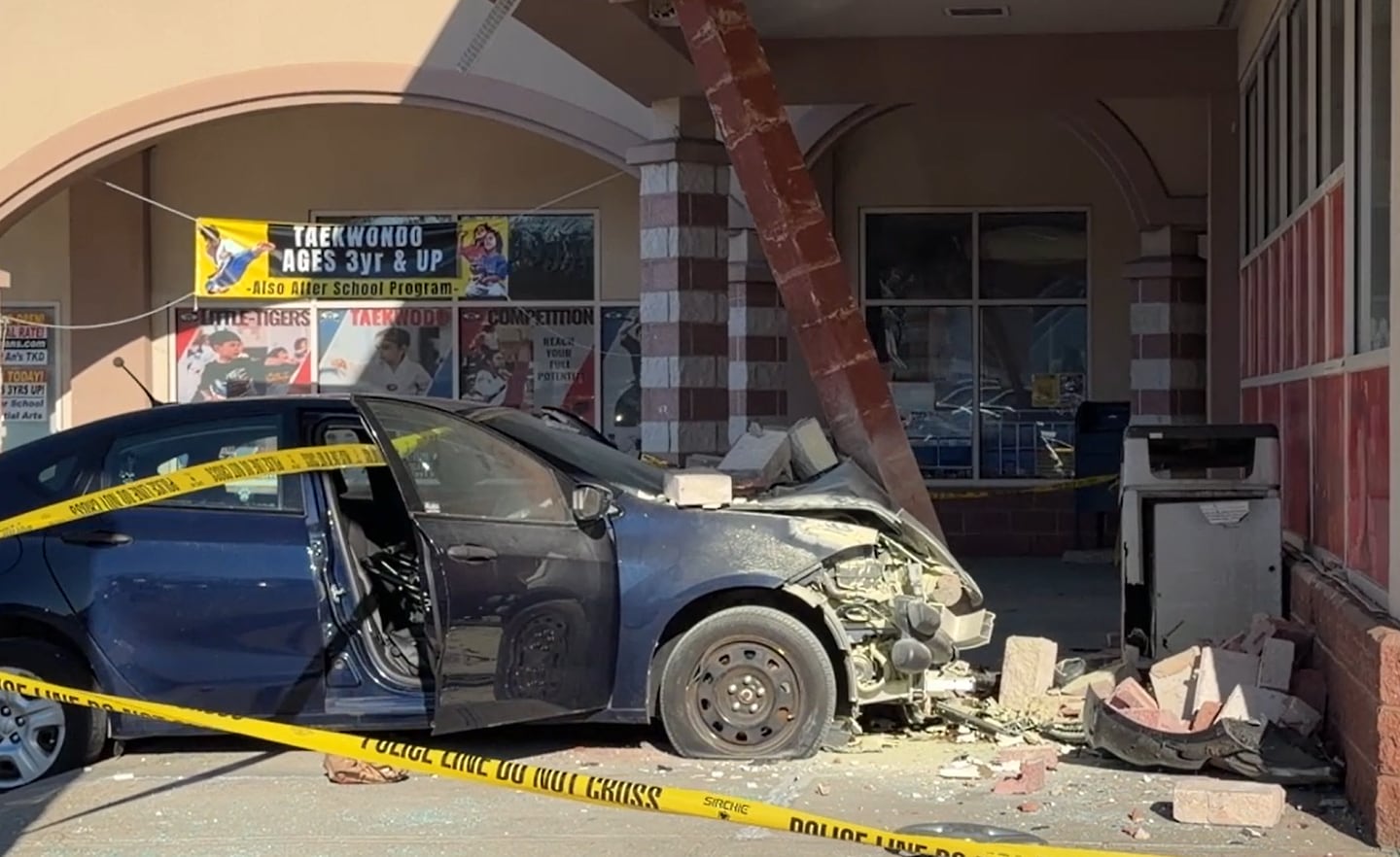 An elderly woman struck a concrete post, just feet away from the store’s entrance. Video from the scene showed dislodged bricks and other debris scattered on the sidewalk.