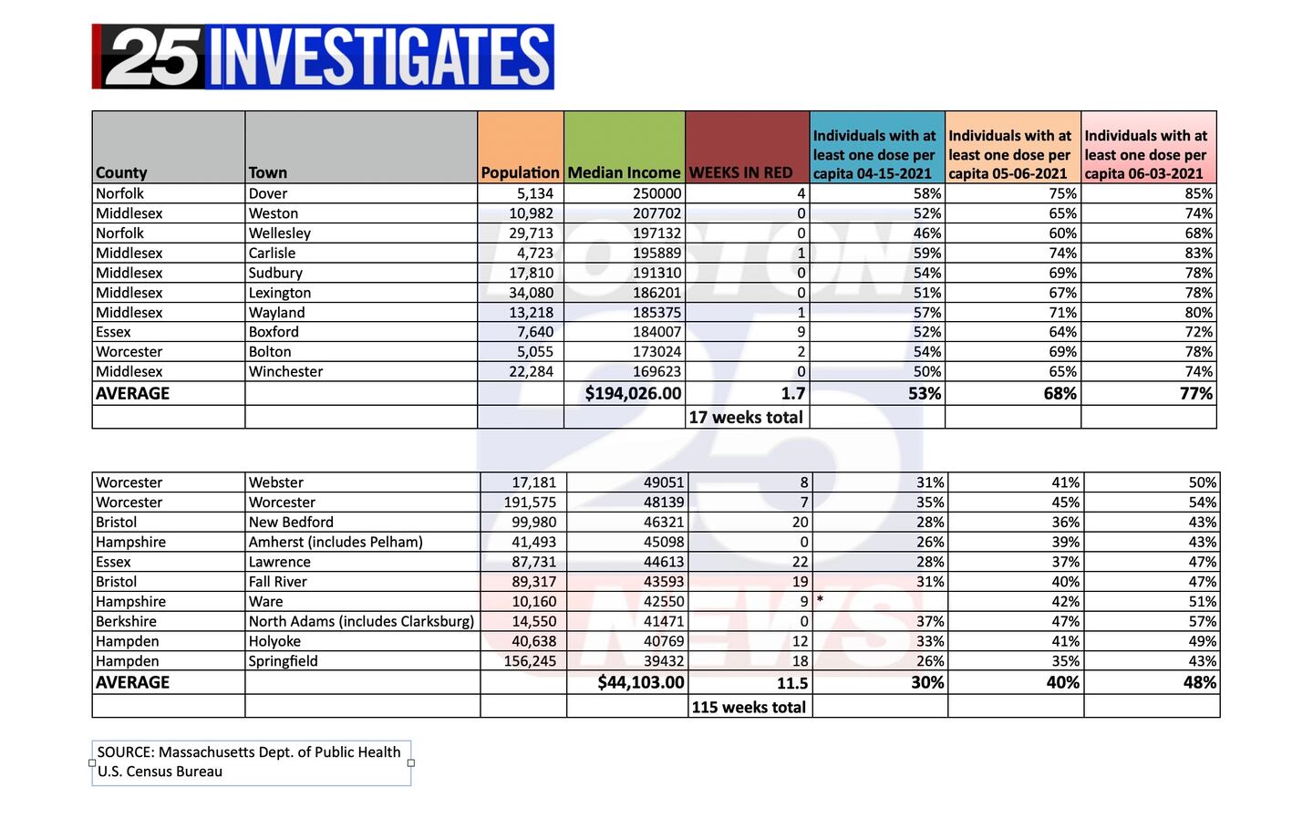 25 Investigates examined data from the Massachusetts Department of Public Health and the U.S. Census Bureau and found the 10 towns with the highest median incomes in the state have a first dose vaccination rate average of 77%. The ten lowest are at 48%.