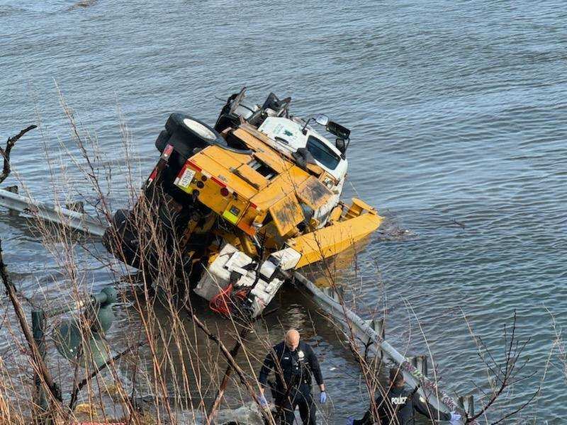 The truck fell approximately 45 feet from the roadway to where it came to rest on its passenger side, partly on a paved pathway that had been submerged in water, in part because of the high tide and heavy rain, state police said.