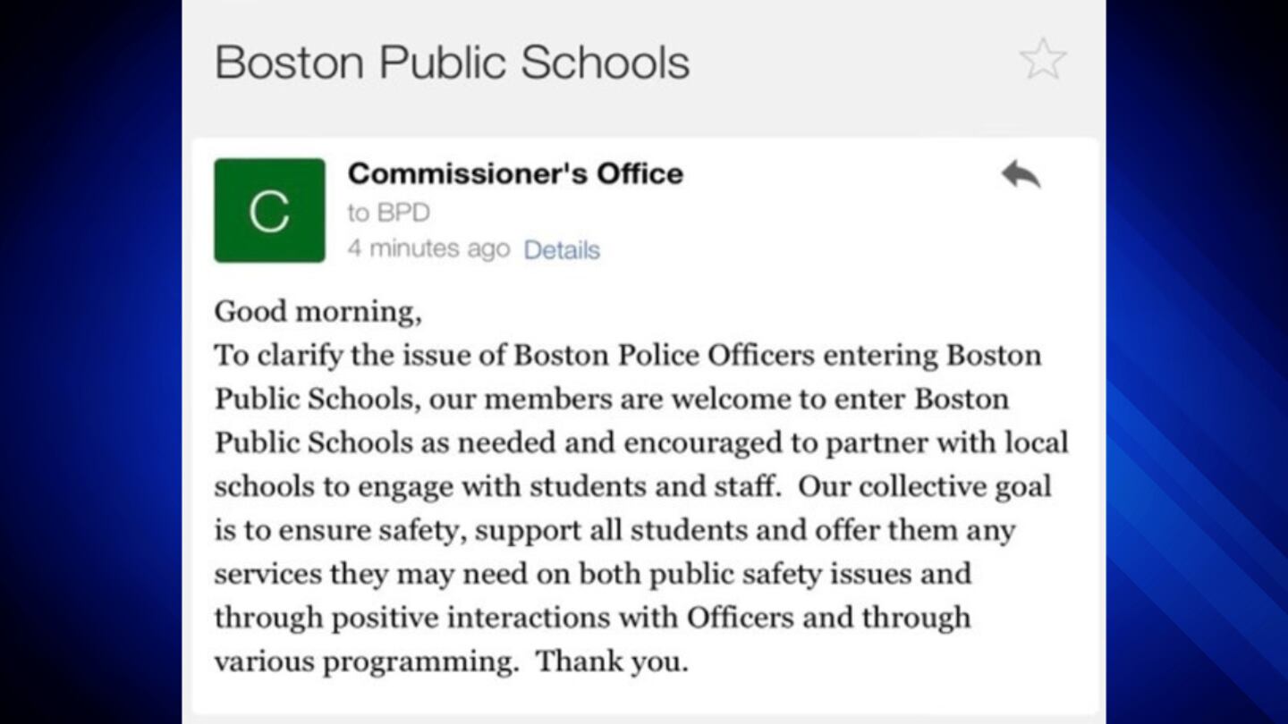 A portion of the email reads: “To clarify the issue of Boston Police Officers entering Boston Public Schools, our members are welcome to enter Boston Public Schools as needed and encouraged to partner with local schools”