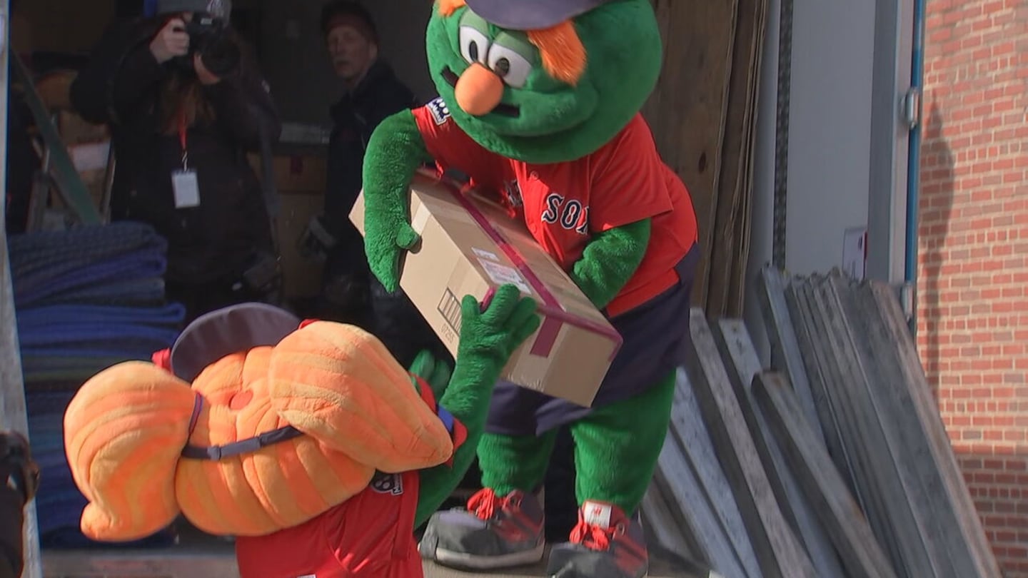 After the equipment was loaded, it was escorted away from Fenway by a flat-bed truck carrying Wally the Green Monster, his sister Tessie, and Fenway Ambassadors who tossed soft Red Sox baseballs to fans gathered for the special sendoff.