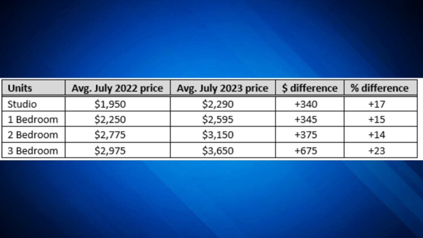 Take a look at the average monthly prices for Boston rental units in July 2022 and July 2023, according to data from the MAPC: