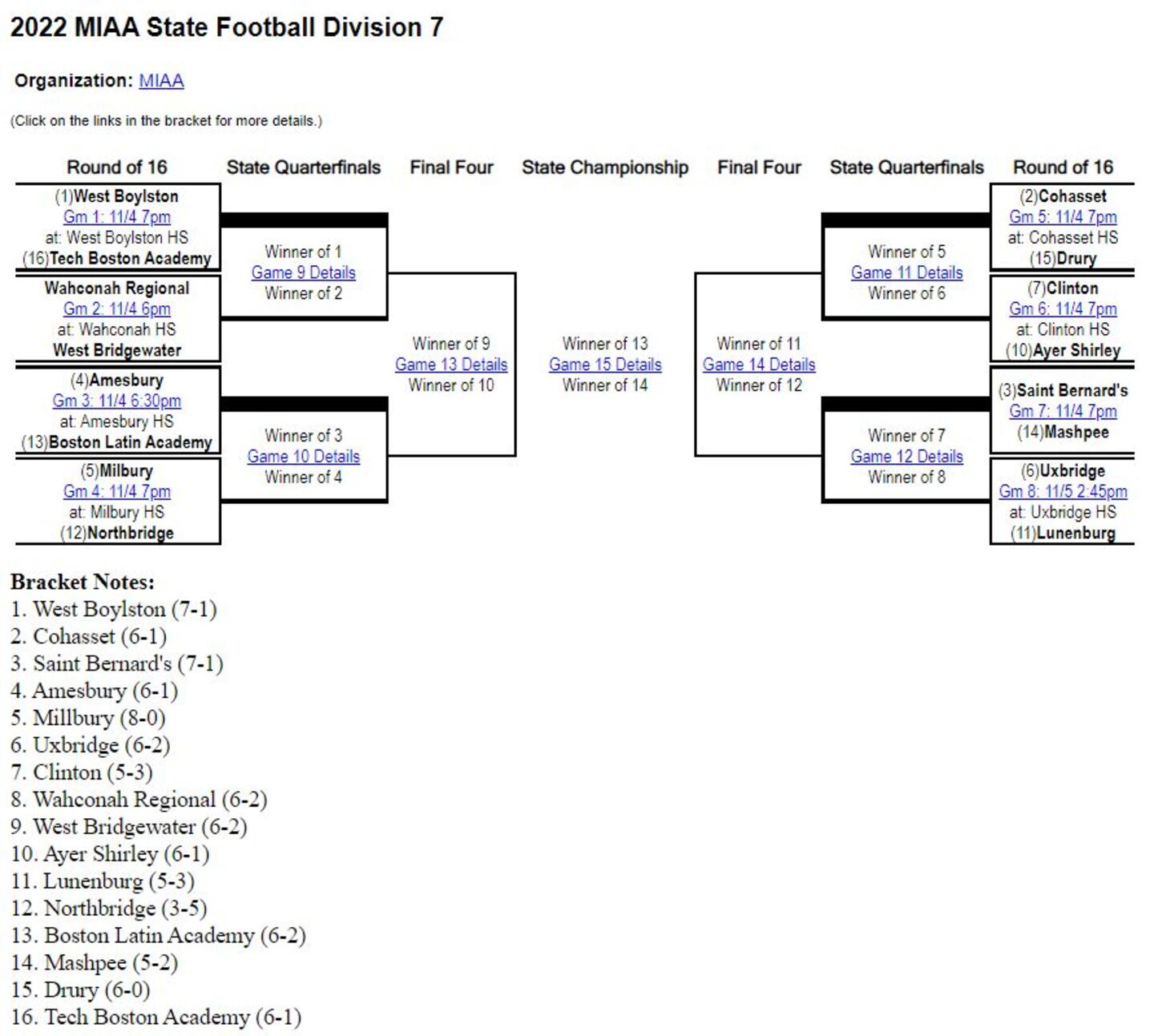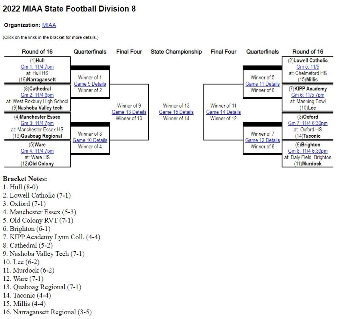 “A total of 128 teams will take part in this year’s postseason, the second to be played under the MIAA’s statewide tournament format,” according to a statement from the Massachusetts Interscholastic Athletic Association. “Each bracket includes the top 16 power-ranked teams for each division with at least 3 victories and 7 games played.”