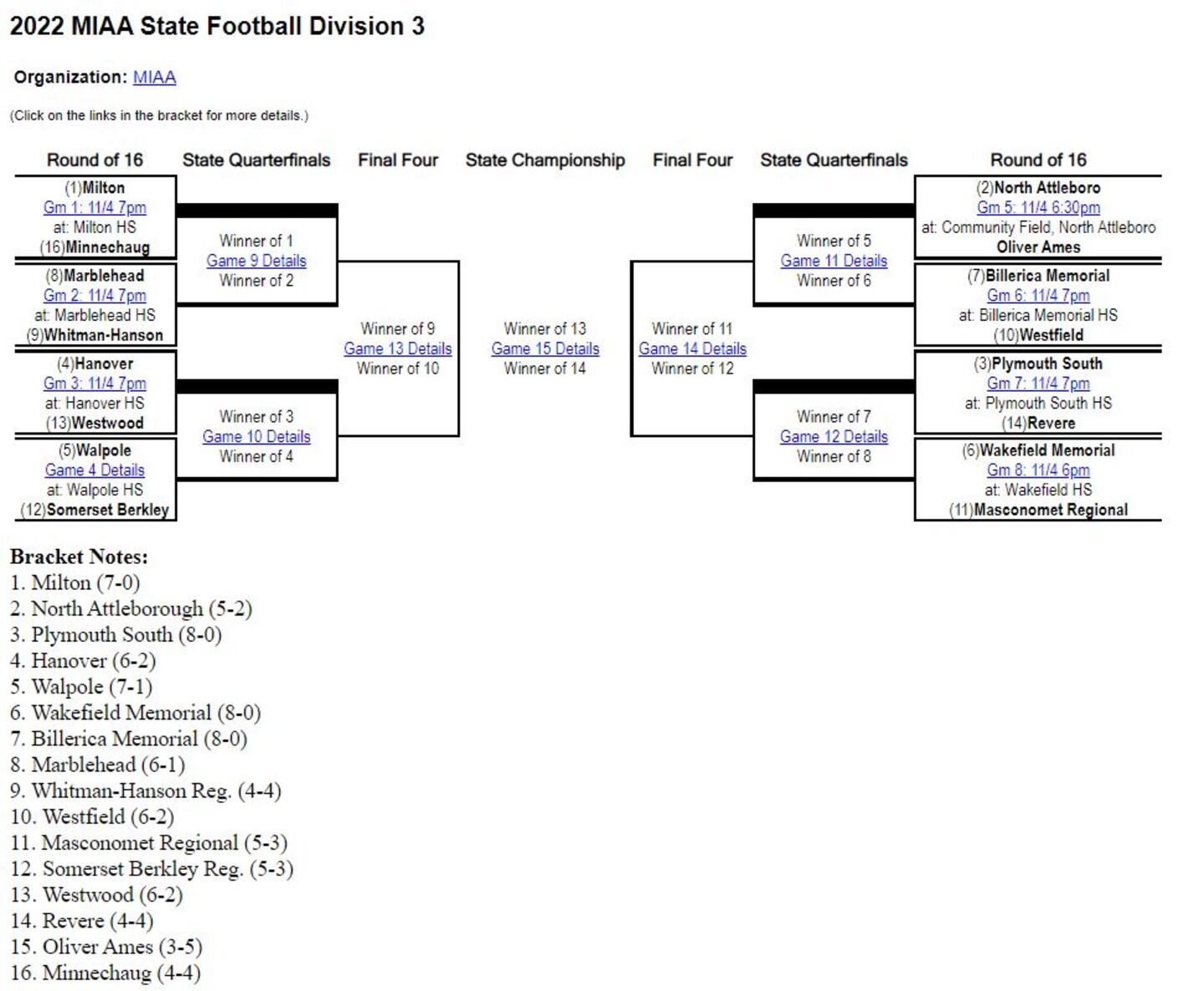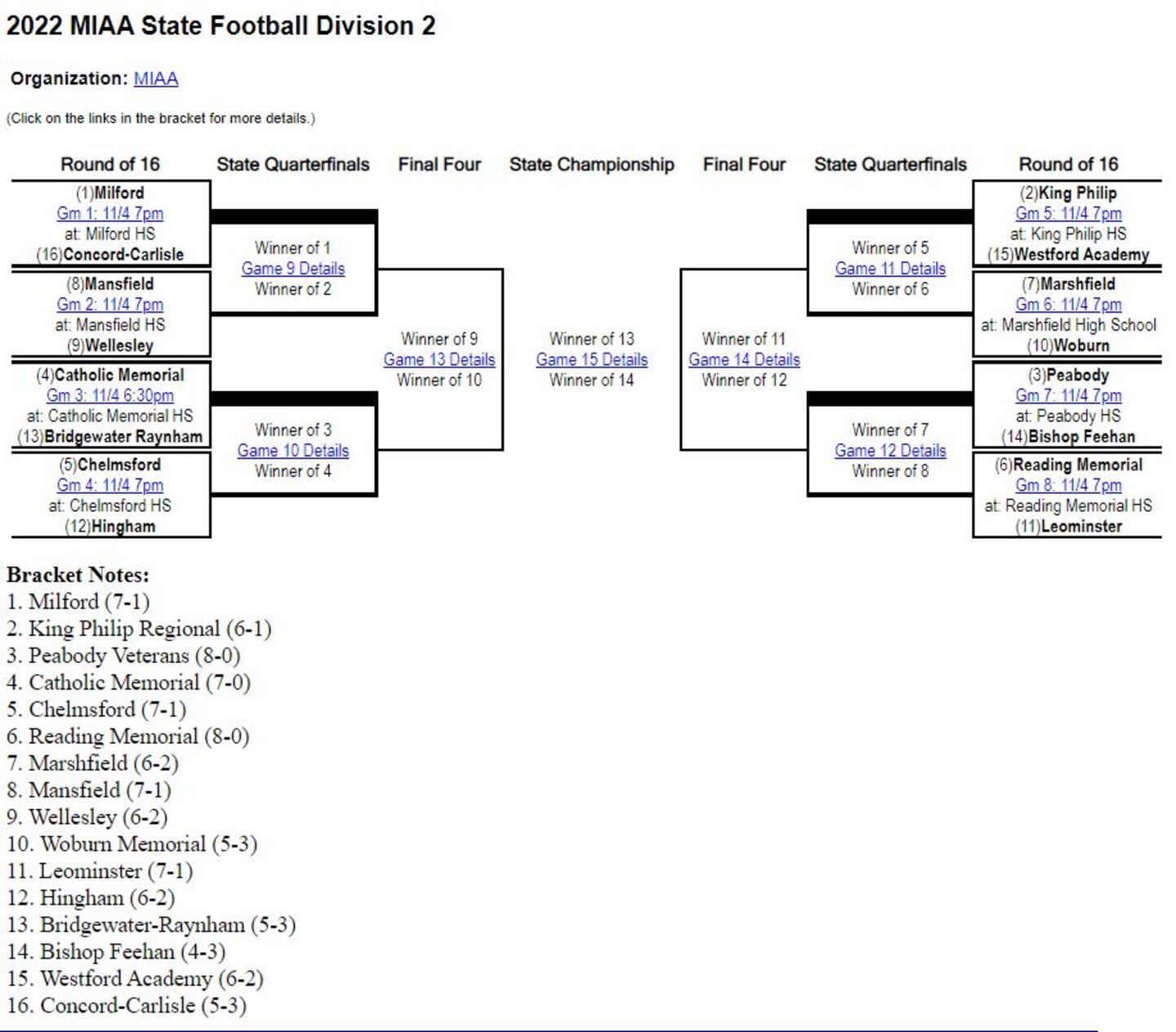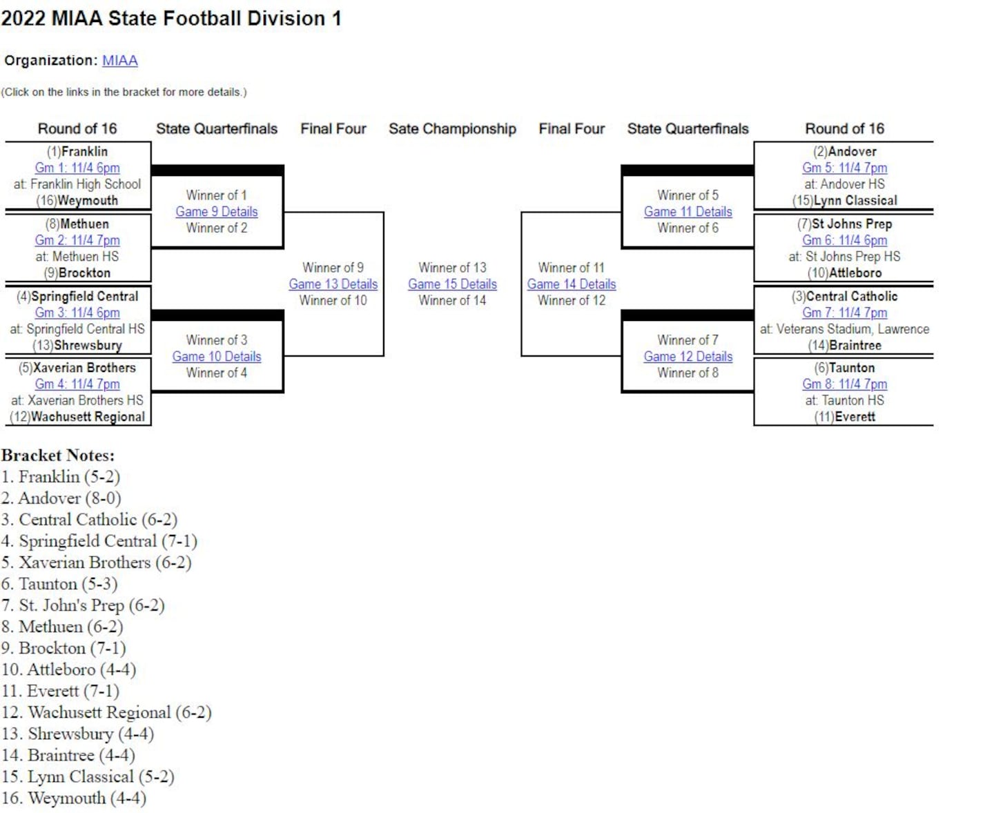FRANKLIN, Mass. — The matchups are now set. The MIAA has released its playoff teams and schedules for the 2022 high school football tournament.