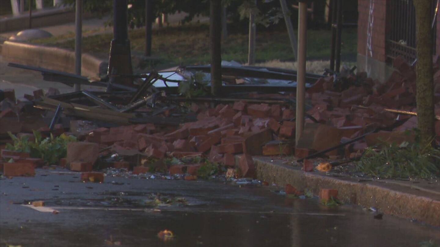 Similarly, the roof of an abandoned building on Pleasant Street was torn off by the wind, sending bricks spilling onto the sidewalk.