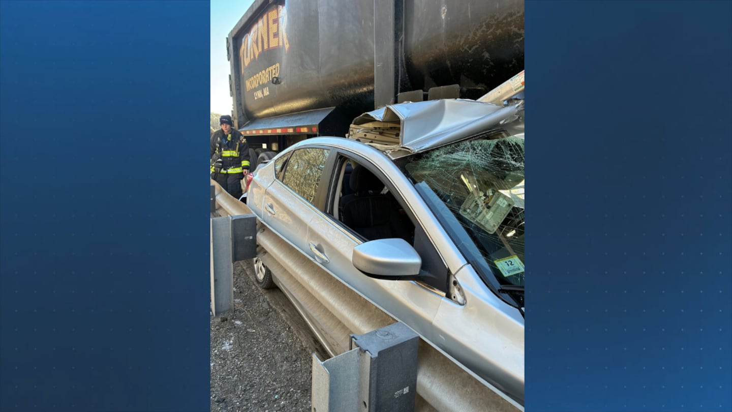 AUBURN, Mass. — Emergency crews responded to a crash between a car and a dump truck on the Massachusetts Turnpike in Auburn, Friday.
