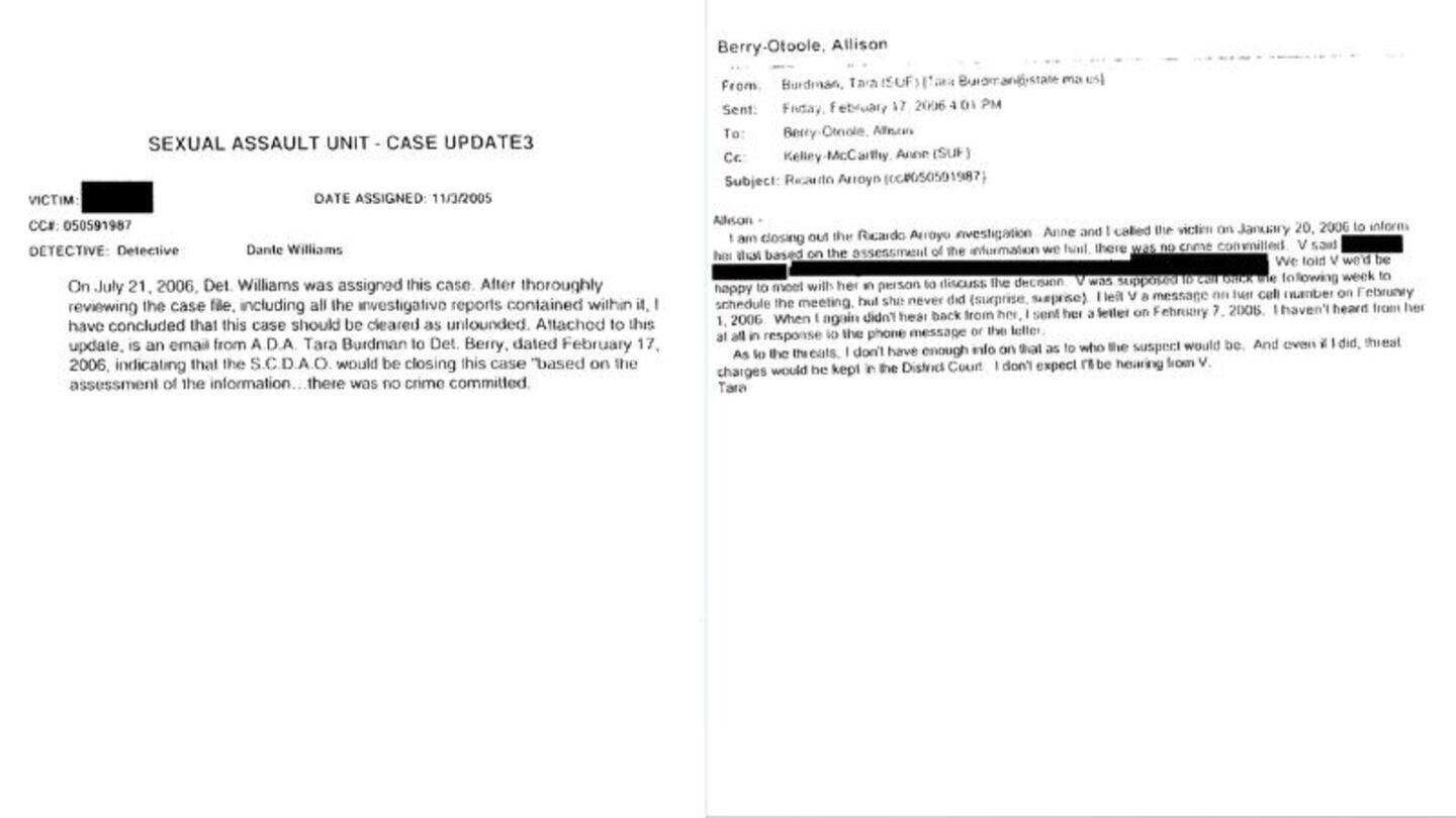 One document, dated November 11, 2005, says a Boston Police detective “concluded that this case should be cleared as unfounded.”