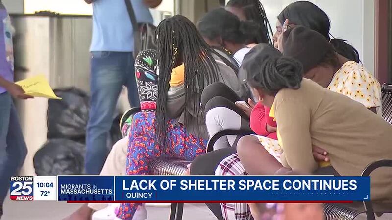 QUINCY, Mass. — Dozens of Haitian migrants, most of whom are children, slept a second night outside the Wollaston MBTA station Tuesday as they wait for emergency shelter.
