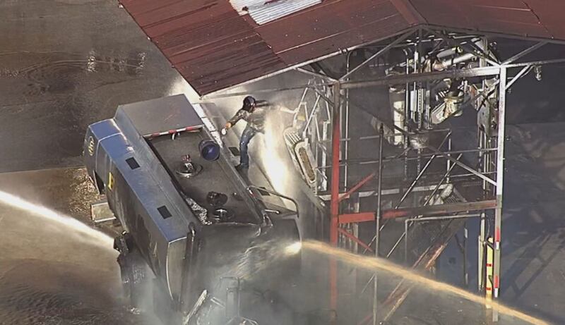 Two workers had to race to pull away a tube that appeared to have been feeding the burning truck. The men raced up the stairs of the rig beside the tanker, and one of them climbed on board the burning tanker to free the tube and then stomped on an open hatch to make sure it was closed.