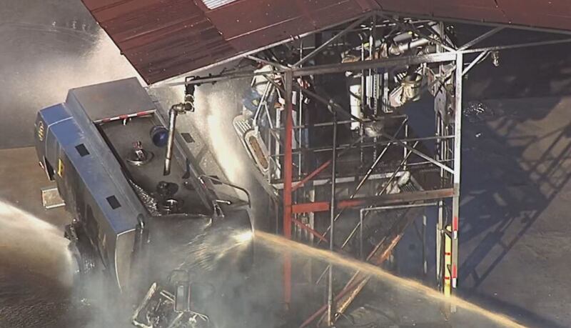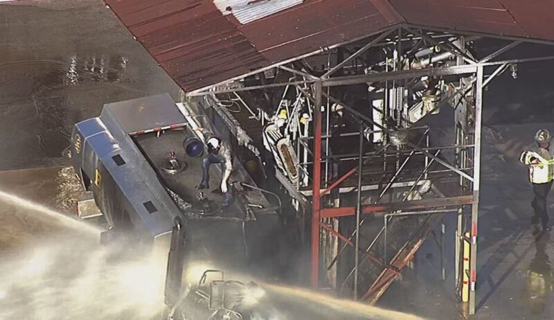 At this point, there doesn’t appear to be any injuries. We’ve also reached out to the company and are waiting to hear back. Several other vehicles were destroyed by flames and the nearby MBTA Commuter Rail service had to be shut down.