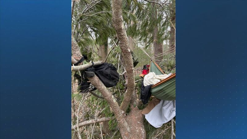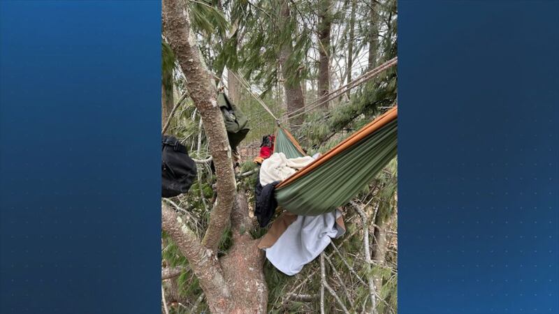 Boxford Police say they responded to the Masconomet Regional Middle/High School around 6:30 a.m. to do their usual sweeps of the areas around the campus. They became aware of a campsite up in a tree on school property along Interstate 95.