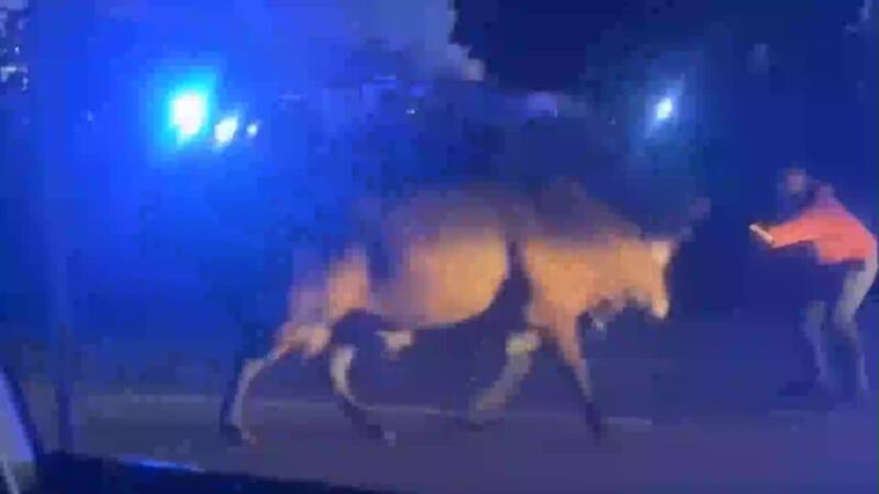 A video shared with Boston 25 showed the wayward bull lift a hoof, rear back, and charge at a man who was attempting to hold the large animal at bay. The man is then seen falling to the ground.