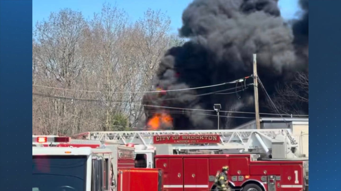 BROCKTON, Mass. — Multiple tractor-trailers were destroyed after a large fire that extended into the woods was extinguished behind a bowling alley in Brockton on Saturday.