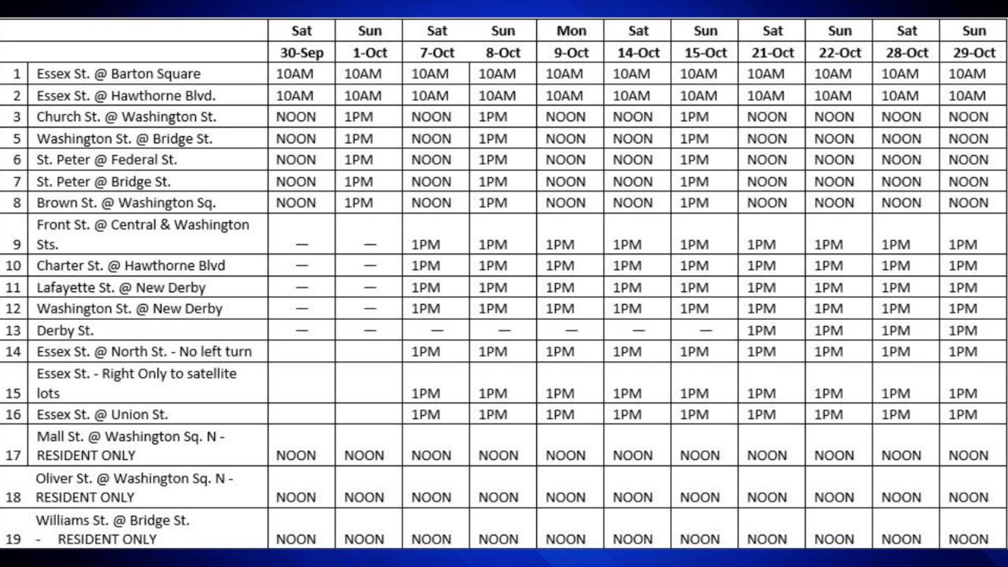 Essex Street from Hawthorne Boulevard to New Liberty Street and Essex Street from Barton Square to Washington Street will be closed to through traffic and no on-street parking will be allowed from 9:00 a.m. to 10:00 p.m. every Saturday and Sunday. Access to the Museum Place Garage will be via Brown Street only.