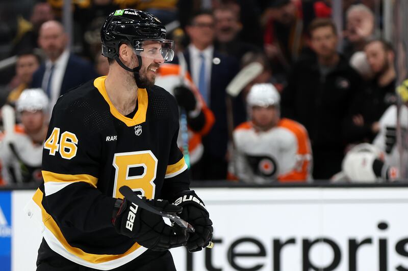 Philadelphia Flyers v Boston Bruins BOSTON, MASSACHUSETTS - JANUARY 16: David Krejci #46 of the Boston Bruins smiles during his 1000th NHL game in the third period against the Philadelphia Flyers at TD Garden on January 16, 2023 in Boston, Massachusetts. The Bruins defeat the Flyers 6-0. (Photo by Maddie Meyer/Getty Images ) (Maddie Meyer/Getty Images)