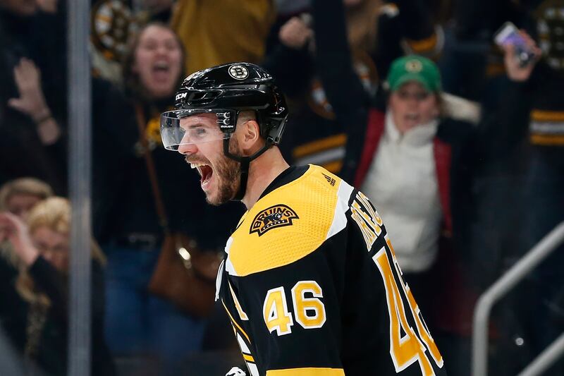 Boston Bruins' David Krejci celebrates his tying goal during the third period of an NHL hockey game against the Minnesota Wild in Boston, Saturday, Nov. 23, 2019. (AP Photo/Michael Dwyer)