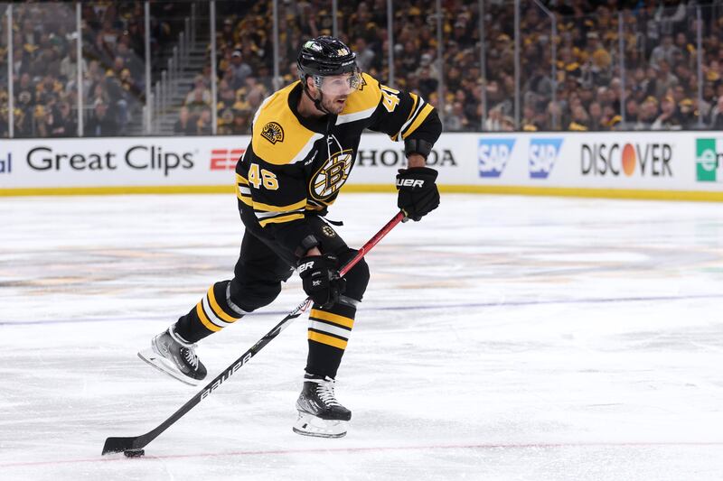 Florida Panthers v Boston Bruins - Game Two BOSTON, MASSACHUSETTS - APRIL 19: David Krejci #46 of the Boston Bruins takes a shot against the Florida Panthers during the third period of Game Two of the First Round of the 2023 Stanley Cup Playoffs at TD Garden on April 19, 2023 in Boston, Massachusetts. The Panthers defeat the Bruins 6-3. (Photo by Maddie Meyer/Getty Images) (Maddie Meyer/Getty Images)