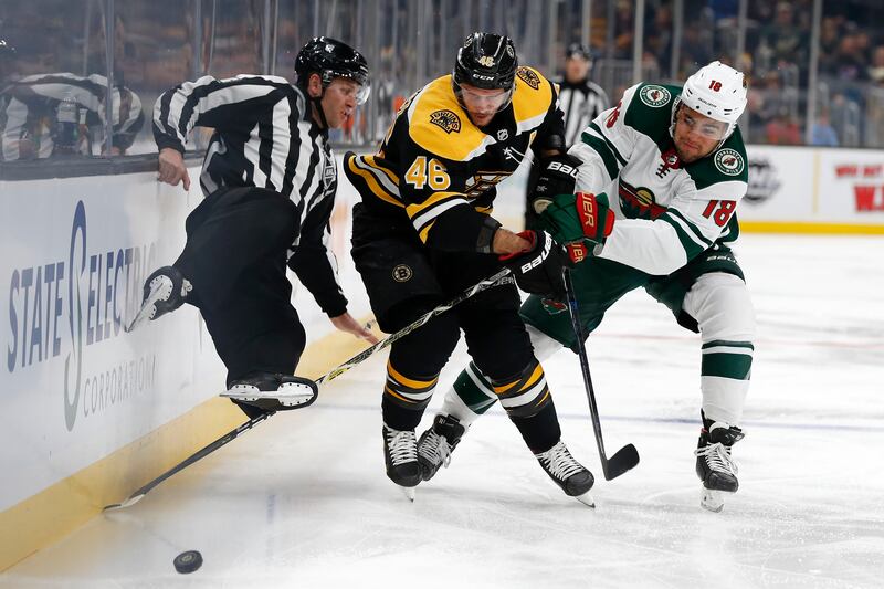 Boston Bruins' David Krejci (46) and Minnesota Wild's Jordan Greenway (18) battle for the puck during the first period of an NHL hockey game in Boston, Saturday, Nov. 23, 2019. (AP Photo/Michael Dwyer)
