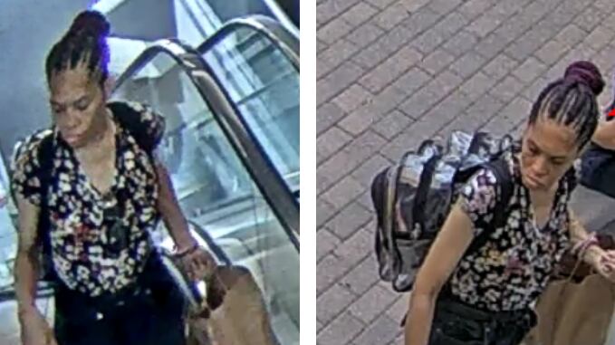 The suspect is described as a light-skinned Black female, wearing a black floral T-shirt, black pants, and multicolored Nike sneakers.