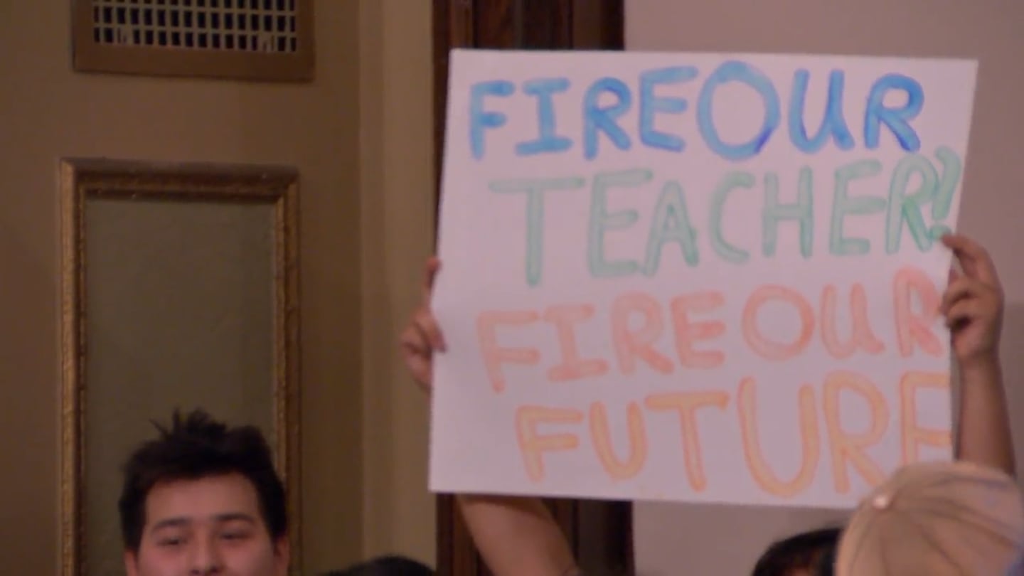 About 40 students had planned to speak during the public comment portion of the hearing. Some passed around a sign that read “Fire our teachers, fire our future.”