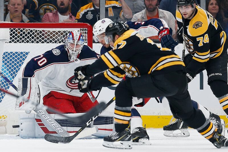 Boston Bruins' Patrice Bergeron, foreground, scores on Columbus Blue Jackets' Joonas Korpisalo (70) during the first period of an NHL hockey game in Boston, Saturday, March 16, 2019. (AP Photo/Michael Dwyer)
