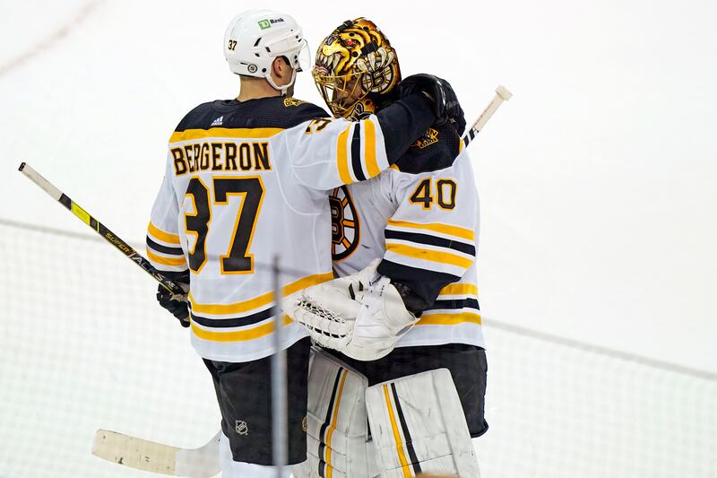 Patrice Bergeron, Tuukka Rask Boston Bruins center Patrice Bergeron (37) embraces teammate Tuukka Rask (40) after an NHL hockey game, Monday, May 3, 2021, in Newark, N.J. (AP Photo/Kathy Willens) (Kathy Willens/AP)