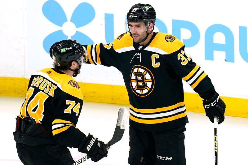 Patrice Bergeron Boston Bruins' Patrice Bergeron is congratulated at the bench after scoring against the Arizona Coyotes during the second period of an NHL hockey game Saturday, Feb. 8, 2020, in Boston. (AP Photo/Winslow Townson) (Winslow Townson/AP)