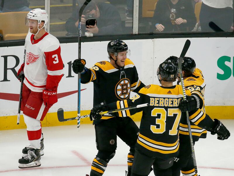 Boston Bruins right wing David Pastrnak celebrates his third goal of an NHL hockey game with teammates Patrice Bergeron (37) and Brad Marchand as Detroit Red Wings defenseman Nick Jensen (3) skates by during the third period Saturday, Oct. 13, 2018, in Boston. (AP Photo/Mary Schwalm)
