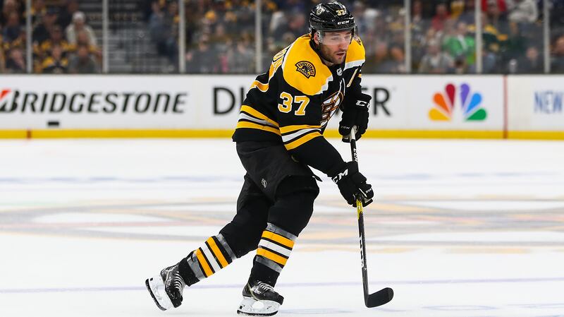 Florida Panthers v Boston Bruins - Game Five BOSTON, MASSACHUSETTS - APRIL 26: Patrice Bergeron #37 of the Boston Bruins looks on against the Florida Panthers during the first period in Game Five of the First Round of the 2023 Stanley Cup Playoffs at TD Garden on April 26, 2023 in Boston, Massachusetts. (Photo by Maddie Meyer/Getty Images) (Maddie Meyer/Getty Images)