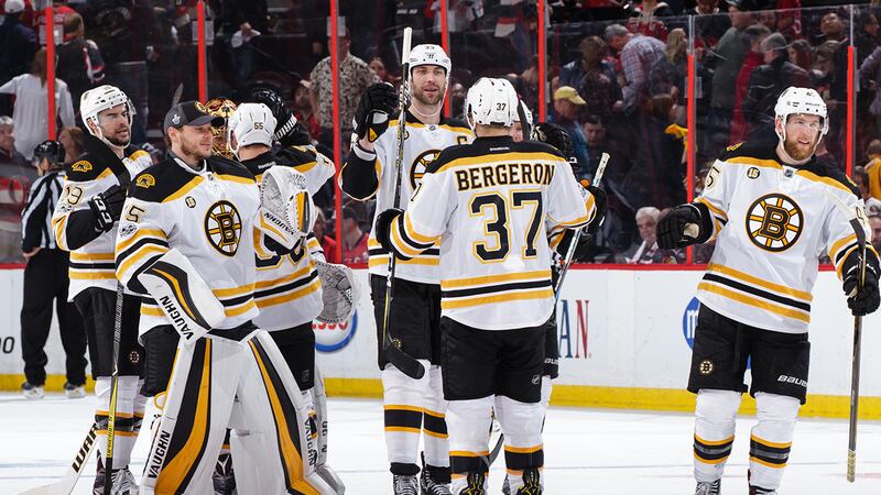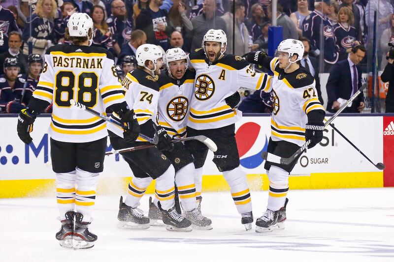 Boston Bruins v Columbus Blue Jackets - Game Four COLUMBUS, OH - MAY 2: Patrice Bergeron #37 of the Boston Bruins is congratulated by his teammates after scoring a power play goal against the Columbus Blue Jackets during the first period in Game Four of the Eastern Conference Second Round during the 2019 NHL Stanley Cup Playoffs on May 2, 2019 at Nationwide Arena in Columbus, Ohio. (Photo by Kirk Irwin/Getty Images) (Kirk Irwin/Getty Images)