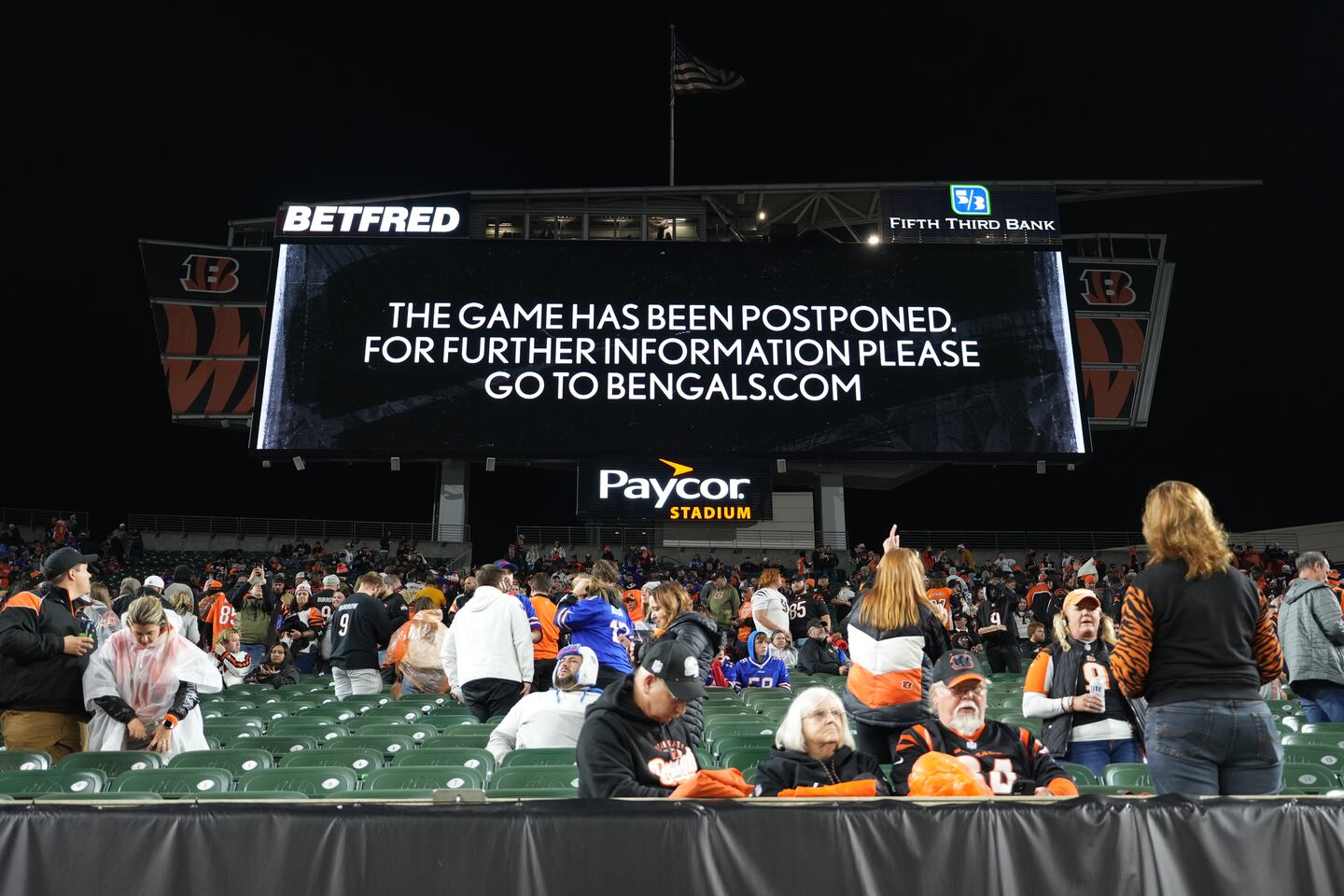 The game was delayed and ultimately postponed. Hamlin was rushed to a hospital for treatment.