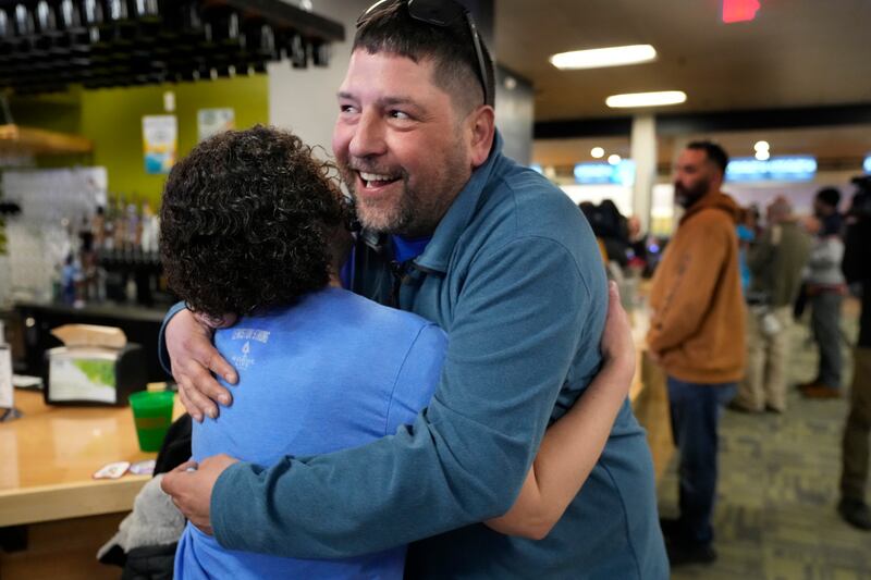 Lewiston bowling alley reopens 6 months after Maine's deadliest mass shooting Justin Juray, owner of Just In Time Recreation, hugs a customer during the reopening of the bowling alley six months after a deadly mass shooting, Friday, May 3, 2024, in Lewiston, Maine. (AP Photo/Robert F. Bukaty) (Robert F. Bukaty/AP)