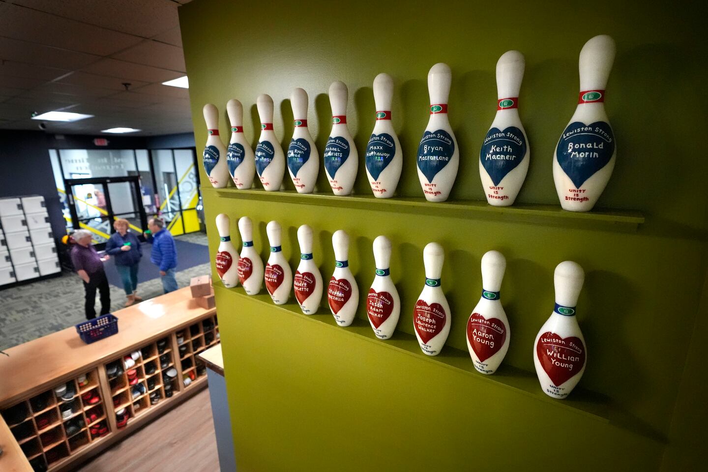 Lewiston bowling alley reopens 6 months after Maine's deadliest mass shooting Bowling pins labeled for each of the 18 victims of the Oct. 25, 2023, mass shooting are displayed at Just In Time Recreation, Wednesday, May 1, 2024, in Lewiston, Maine. The bowling alley, where eight people were killed, was scheduled to reopen Friday, May 3. An additional 10 people were killed at nearby bar. (AP Photo/Robert F. Bukaty) (Robert F. Bukaty/AP)