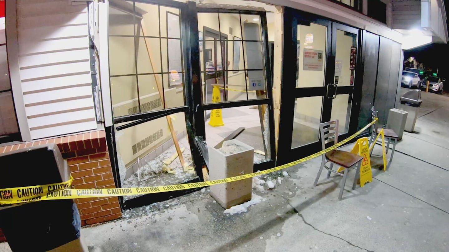 Emergency crews responding to a rest area on Route 24 south in Bridgewater just after 4 a.m. learned a driver of a Ford F-350 bearing a Maine registration had crashed into glass doors that led to a Burger King before fleeing, state police said.