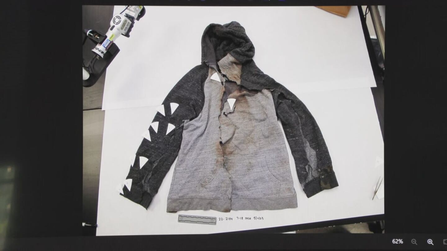 The evidence included a gray and black sweatshirt, an orange colored t-shirt and the jury saw John O’Keefe’s red and brown stained clothing for the first time.