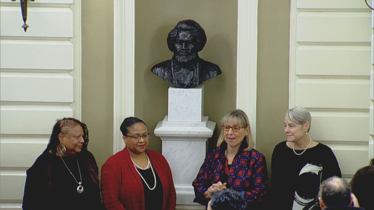 BOSTON (AP) — A bust of famed abolitionist Frederick Douglass was unveiled in the Massachusetts Senate Chamber on Wednesday, the first bust of an African American to be permanently added to the Massachusetts Statehouse.