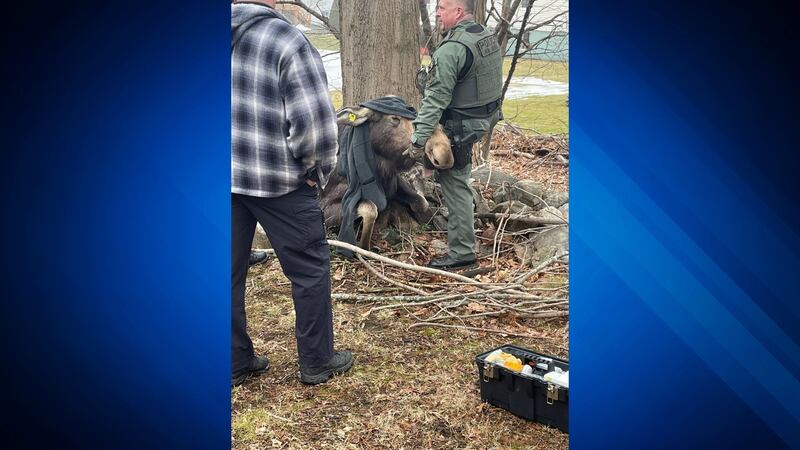 MARLBOROUGH, Mass. — A moose was seen wandering around a backyard in the area of Shawmut Avenue in Marlborough early Tuesday morning. Officers from the Marlborough Police Department and the Massachusetts Environmental Police quickly set up a perimeter around the area to capture the gentle giant.