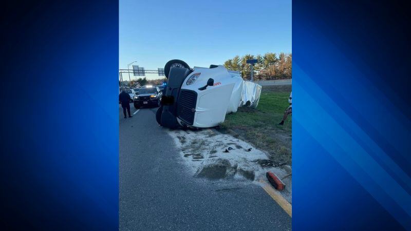 The Weston Fire Department says crews have been on scene since 3:30 p.m. on the eastbound side of the Pike near exit 123 to Route 95. A tractor trailer carrying 7,000 pound rolls of paper flipped on its side, blocking most of the left lane, according to authorities.