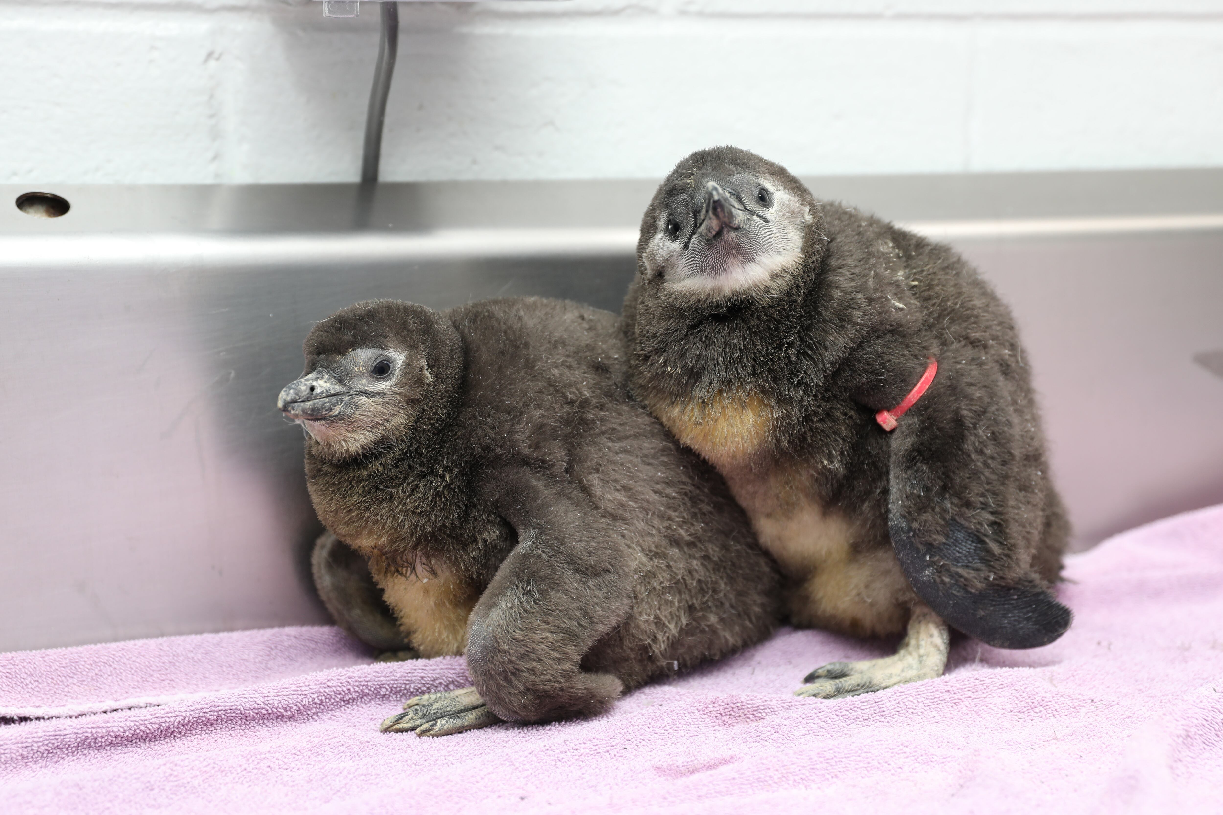 Trainers and staff at the aquarium are working with the penguin chicks to become more comfortable with the other penguins.