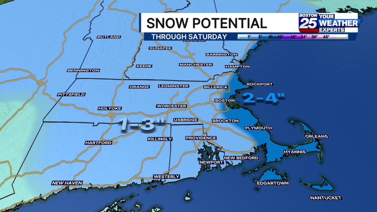 There is the potential for 1 to 3 inches of snow in most areas, including the South Coast, Merrimack Valley, Worcester County, and western Massachusetts.