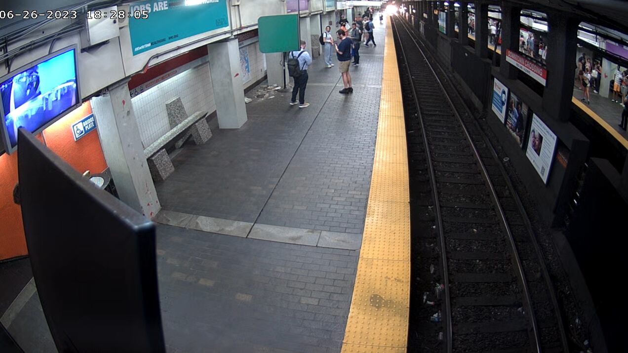 BOSTON — The MBTA released a new video that shows chunks of concrete falling from the ceiling near riders at the Downtown Crossing station on Monday.