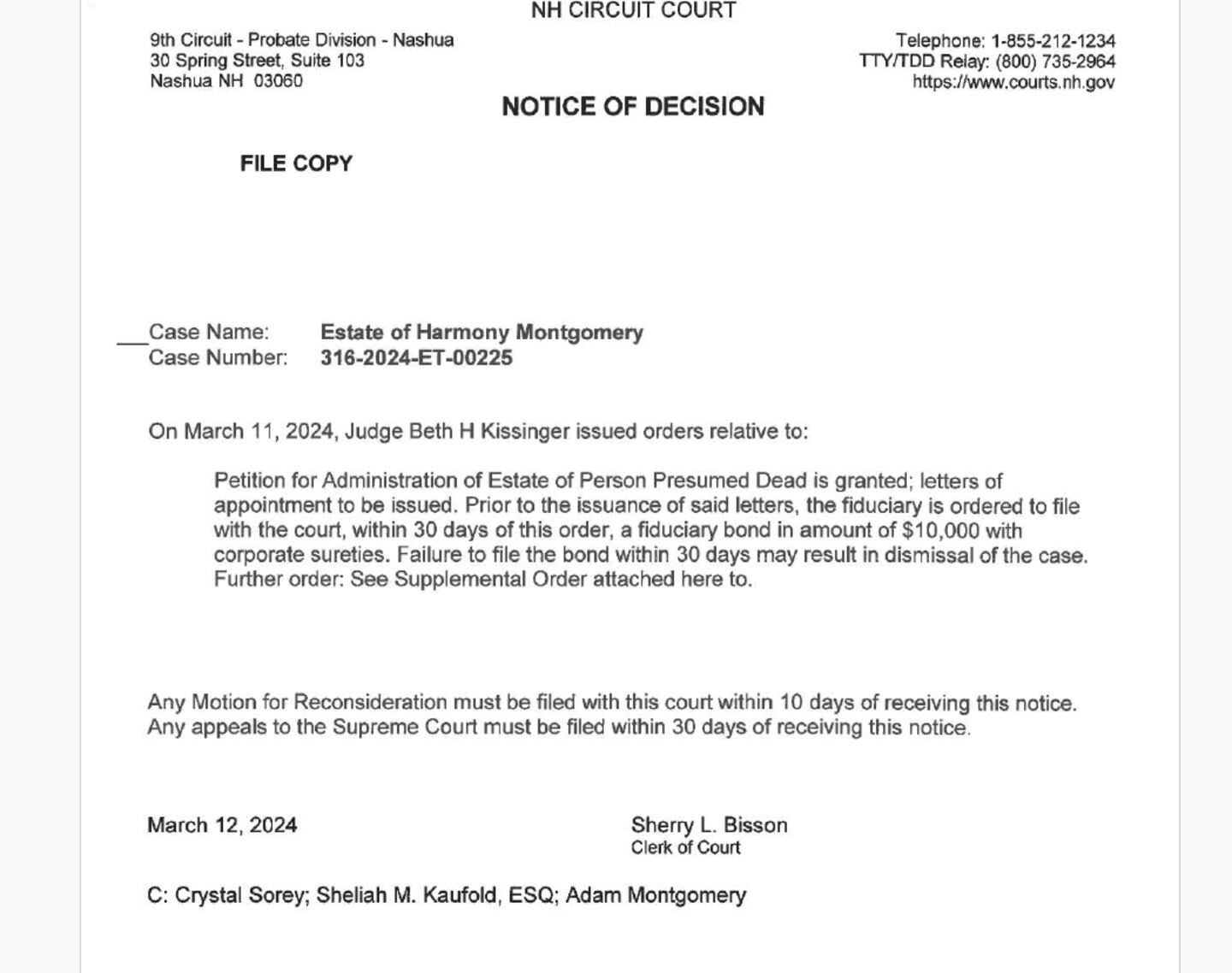 Judge Beth H. Kissinger issued the ruling after Crystal Sorey, Harmony’s mother, petitioned a probate court in Nashua on Monday to declare her daughter legally dead and to be appointed as administrator of her estate.
