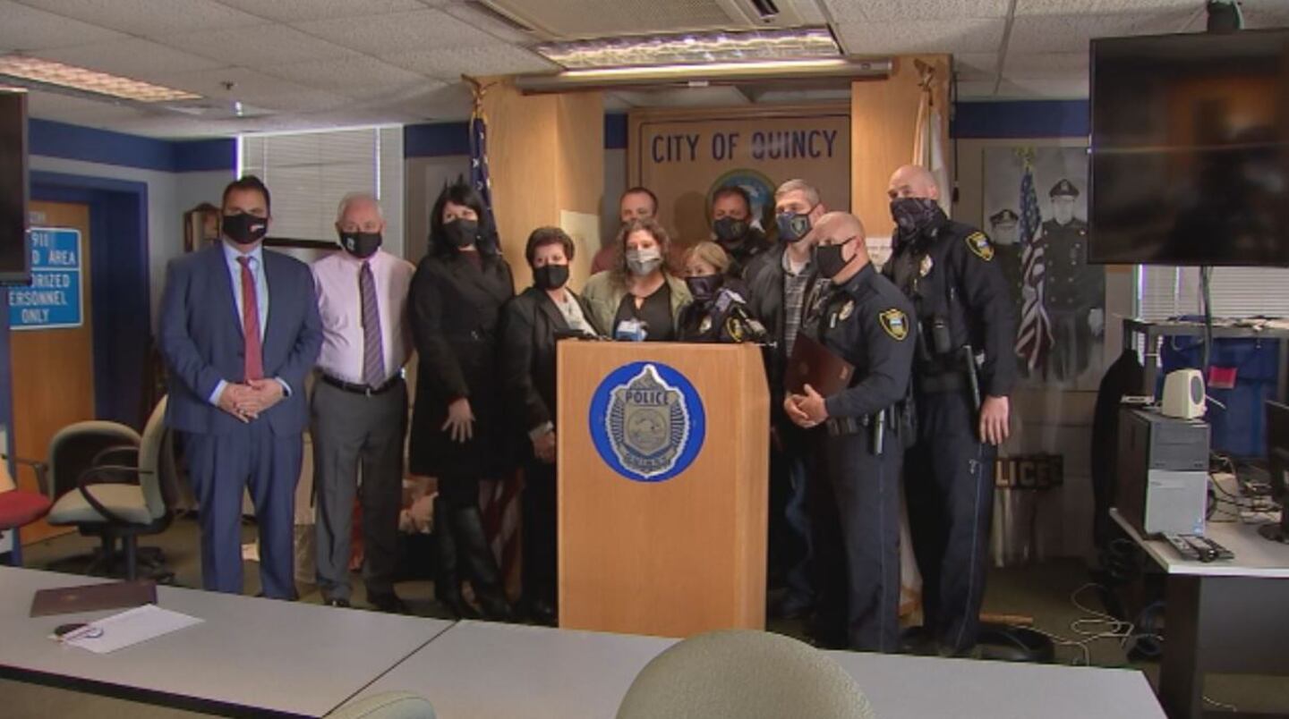 QUINCY, Mass. — Everett Mayor Carlo DeMaria recognized a group of Quincy police officers Wednesday for their heroic rescue that saved his niece’s life.