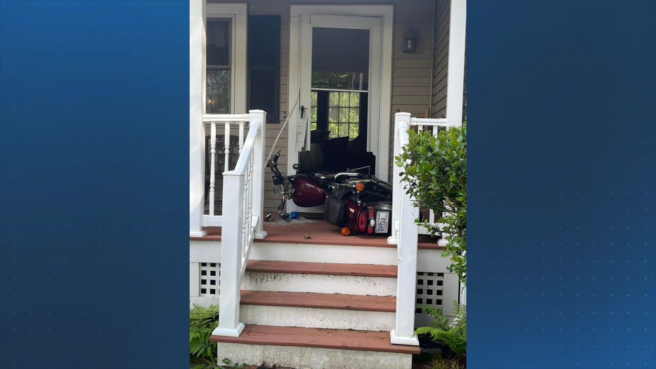 BELLINGHAM, Mass. — A motorcycle was found wedged into the front door of an occupied home following a collision on Monday.