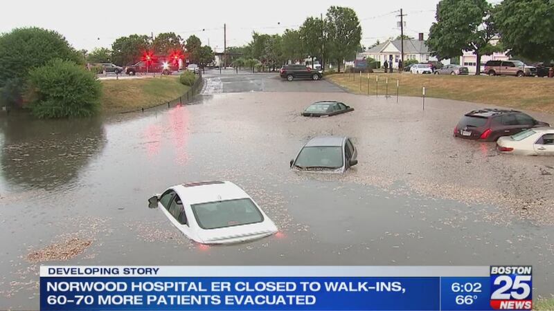 NORWOOD, Mass. — Workers at Norwood Hospital went running for safety as floodwaters tore down doors in the basement of the building Sunday and around 80 patients were evacuated.