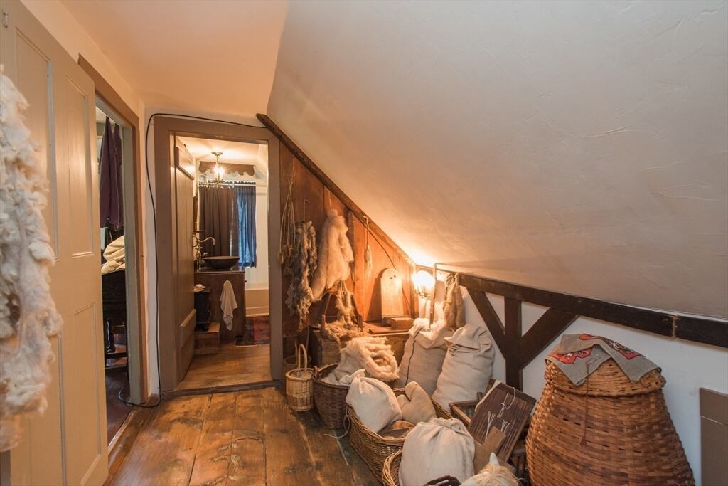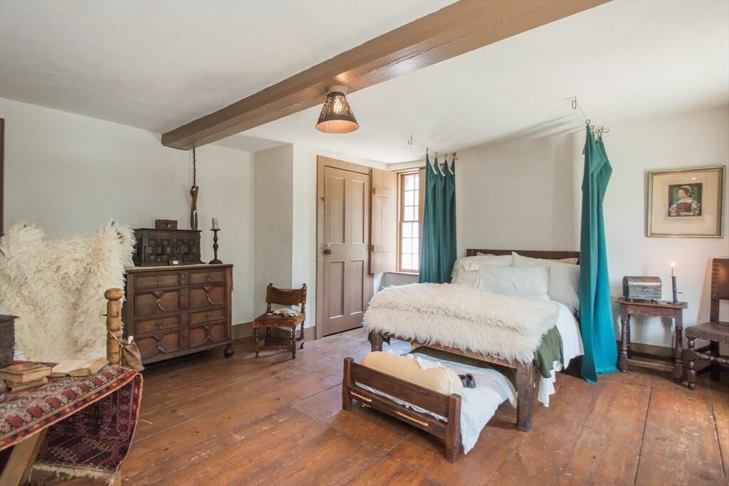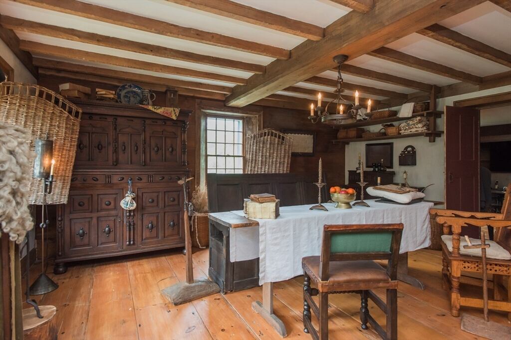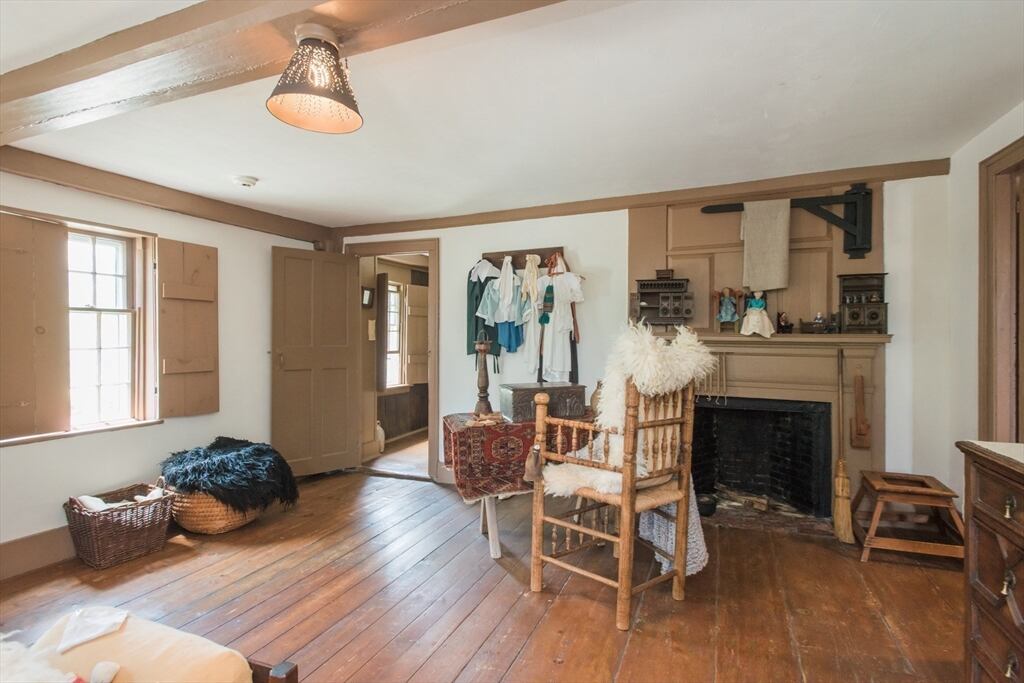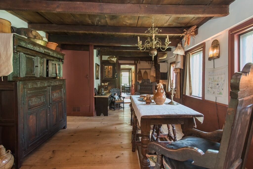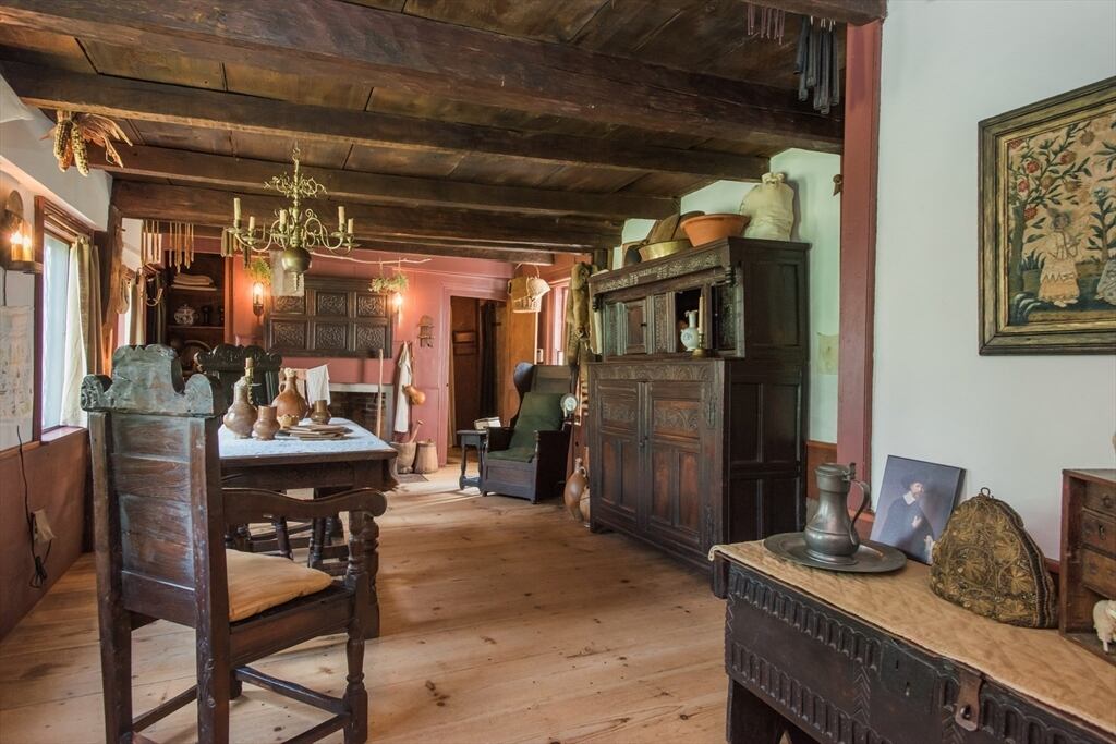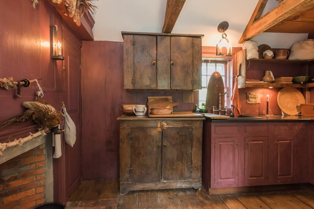 “Step back in time to enjoy the workable fireplaces, new but period leaded glass windows, wide pine floors, antique and custom replica windows, exposed hand-hewn beams, vaulted custom kitchen, custom wainscotting, and more,” the listing reads. “This is a rare, first-period timber framed home that includes many historic features as well as modern amenities such as three workable fireplaces, a brand new oil tank, updated electrical, forced hot air heat, a newer full house generator, and first-floor laundry room.”
