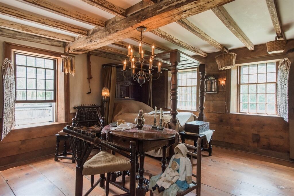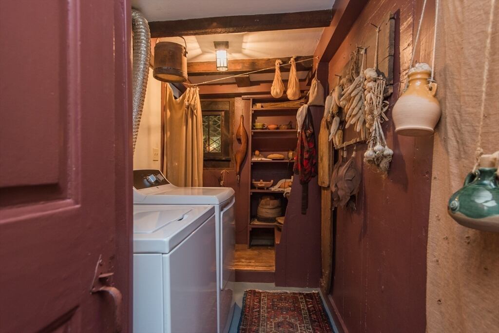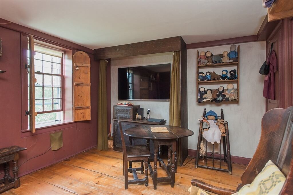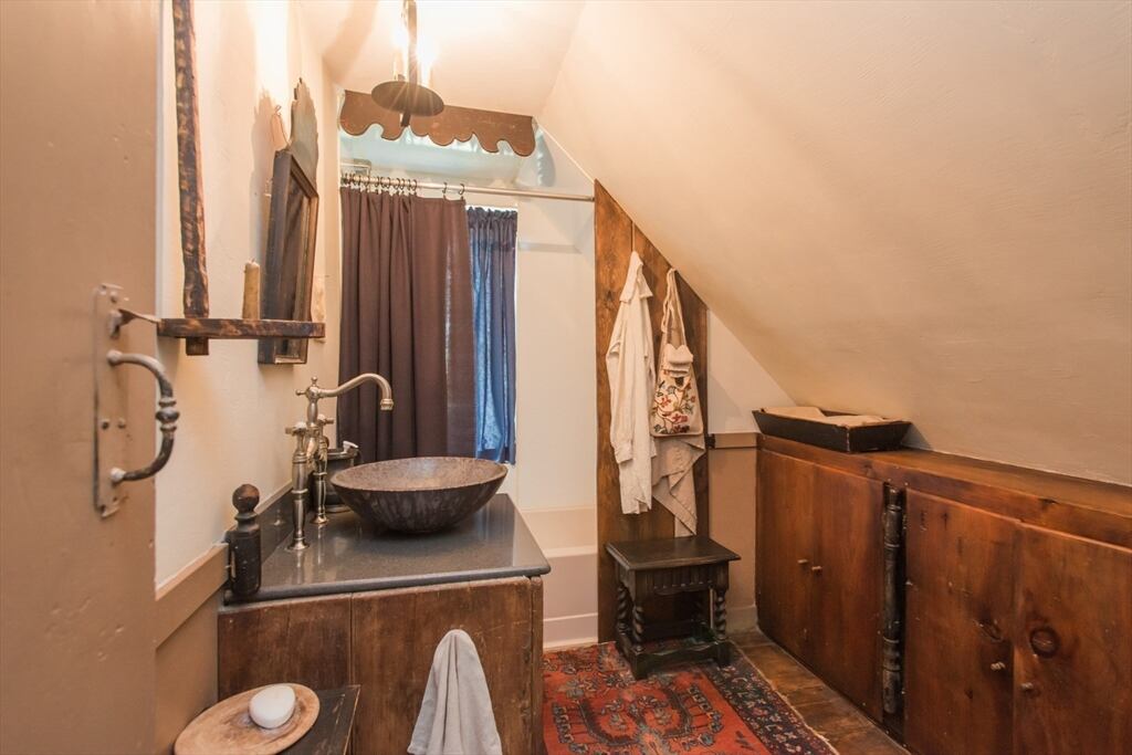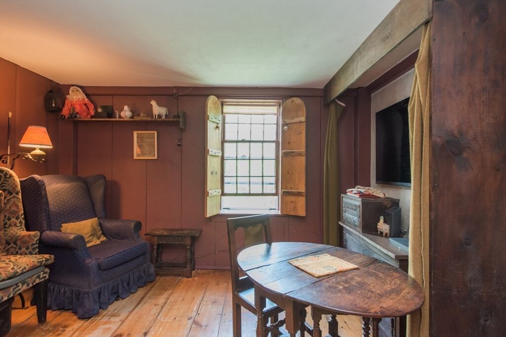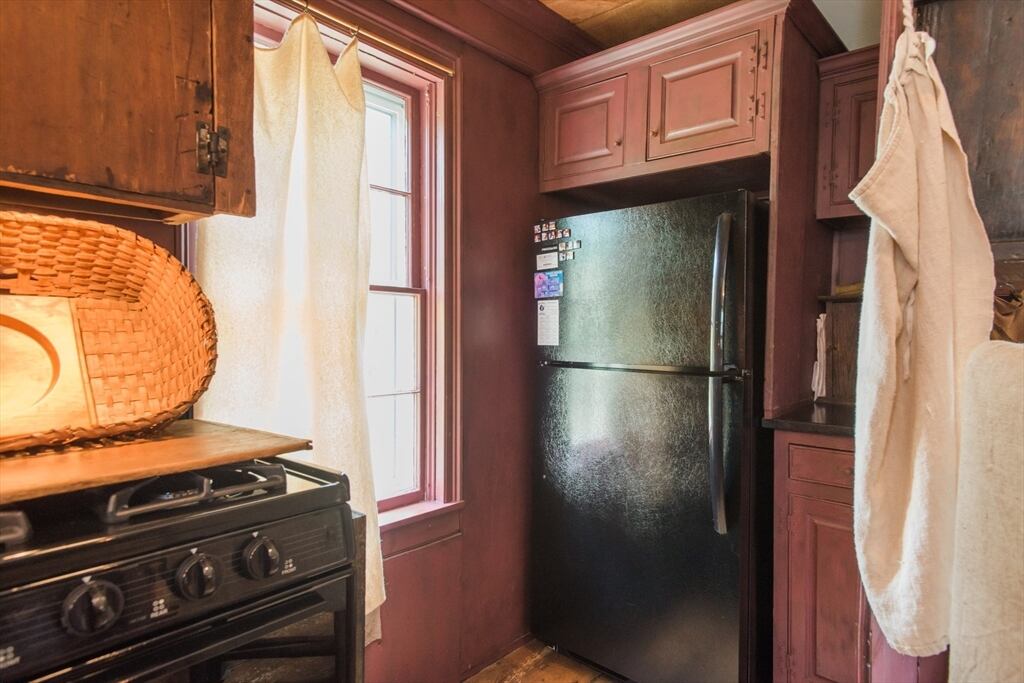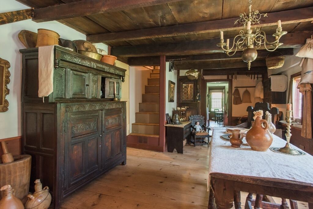 “Step back in time to enjoy the workable fireplaces, new but period leaded glass windows, wide pine floors, antique and custom replica windows, exposed hand-hewn beams, vaulted custom kitchen, custom wainscotting, and more,” the listing reads. “This is a rare, first-period timber framed home that includes many historic features as well as modern amenities such as three workable fireplaces, a brand new oil tank, updated electrical, forced hot air heat, a newer full house generator, and first-floor laundry room.”