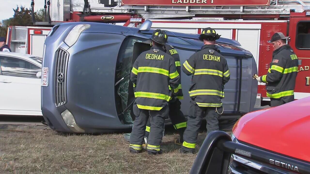 DEDHAM, Mass. — One person was taken to the hospital after a rollover crash involving three cars in Dedham Thursday morning.
