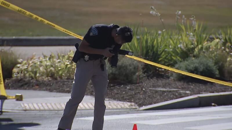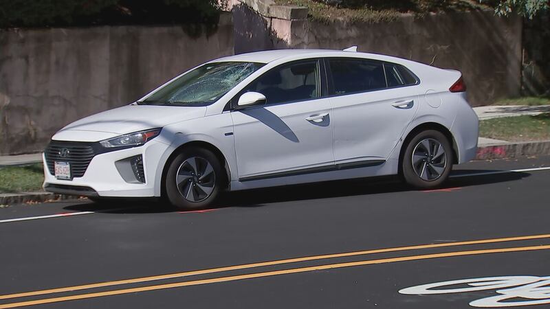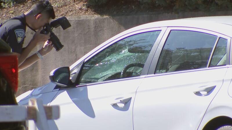 Video from the scene showed investigators photographing a white sedan with heavy windshield damage.