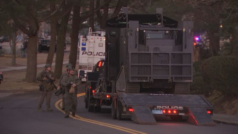 A Boston 25 News photographer captured several police vehicles, including SWAT team members lining the road.